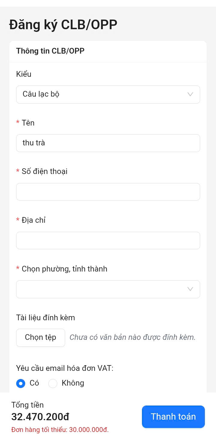 - Bước 4: Người dùng điền đầy đủ thông tin đăng ký CLB / OPP theo biểu mẫu hiển thị.