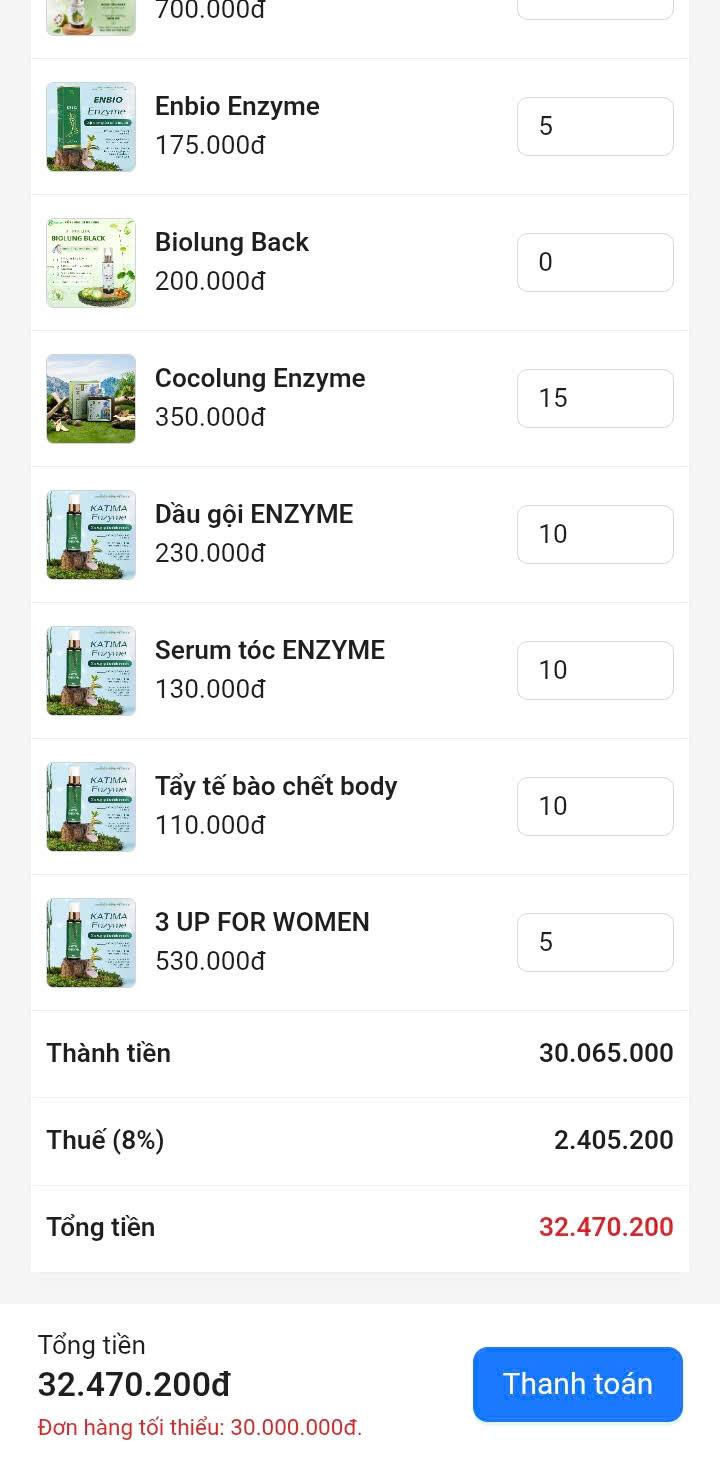 - Bước 2: Người dùng nhập số lượng cho từng sản phẩm muốn mua đến khi đạt giá trị bắt buộc: