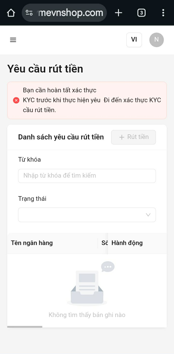 - Bước 1: Người dùng truy cập trang "Yêu cầu rút tiền" và nhấn "Đi đến xác thực KYC"